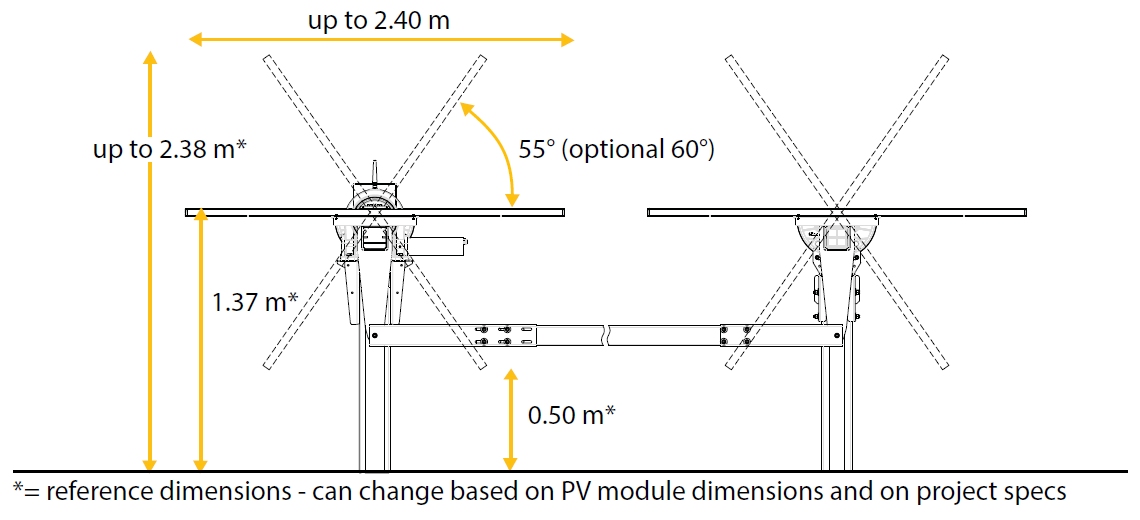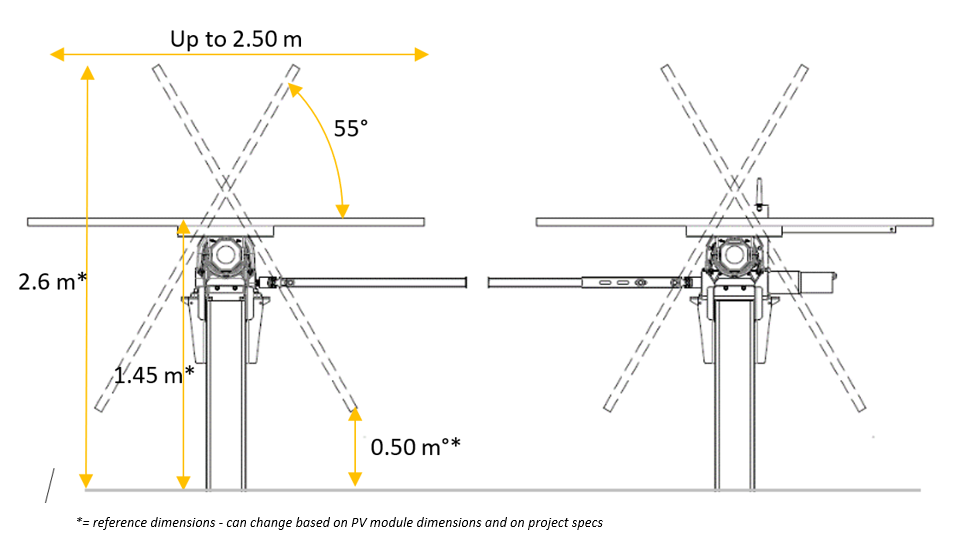 iTracker DuettoTM is developed to ensure a limited length of the tracker, ideal for terrains with irregular borders and/or height, while maintaining a 1-module-in-Portrait configuration, which ensures protection against dynamic wind instability. This results in an optimised architecture which combines several benefits:
