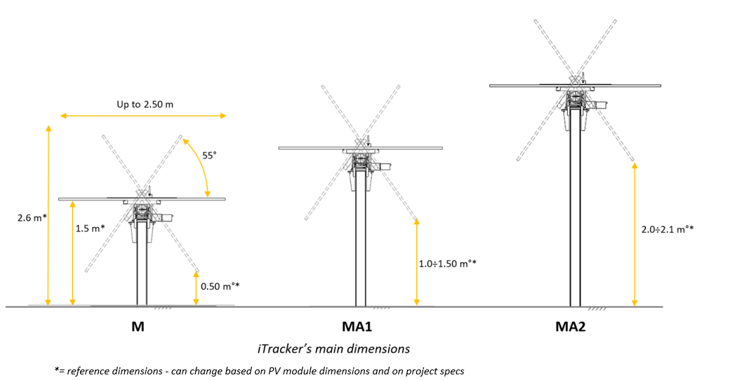 MA1: for advanced agrivoltaic applications, where the minimum height from the ground at maximum tilt ranges from 1 to 1.5 m (typically 1.3m);